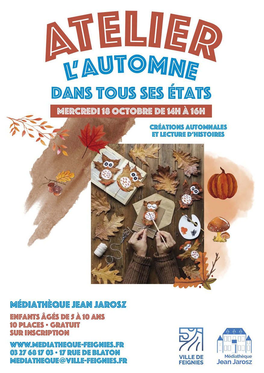 octobre, 2023 Atelier « L'Automne dans tous ses états » Médiathèque Jean Jarosz 17 rue de Blaton 2023mer18oct14 h 00 min16 h 00 minAtelier « L'Automne dans tous ses états »14 h 00 min - 16 h 00 min Médiathèque Jean Jarosz, 17 rue de BlatonType d'événement:Culture,Jeunesse Détails de l'événement Détails de l'événement Date (Mercredi) 14 h 00 min - 16 h 00 min LieuMédiathèque Jean Jarosz17 rue de Blaton CalendrierCalendrier Google