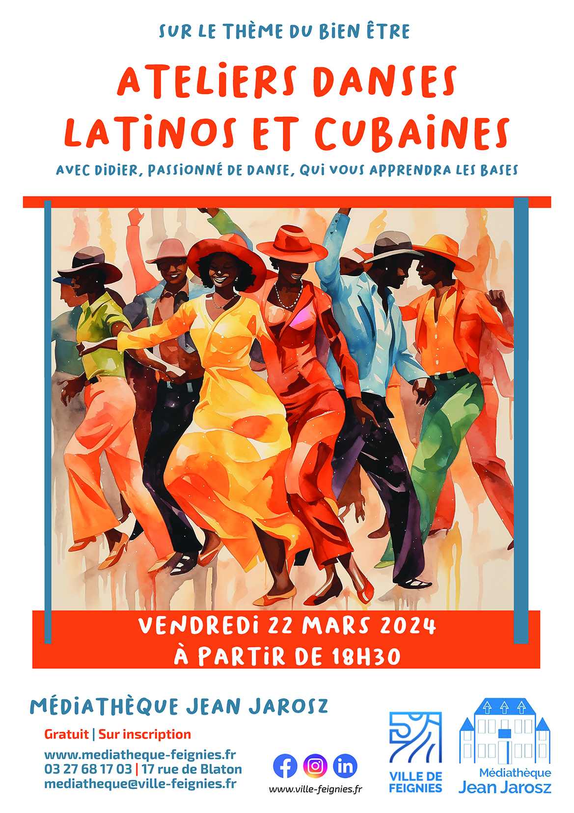 mars, 2024 Atelier danses latinos et cubaines Médiathèque Jean Jarosz 17 rue de Blaton 2024ven22mar18 h 30 min20 h 00 minAtelier danses latinos et cubaines18 h 30 min - 20 h 00 min Médiathèque Jean Jarosz, 17 rue de BlatonType d'événement:Culture,Fêtes,Musique,Spectacle Détails de l'événement Détails de l'événement Date (Vendredi) 18 h 30 min - 20 h 00 min LieuMédiathèque Jean Jarosz17 rue de Blaton CalendrierCalendrier Google