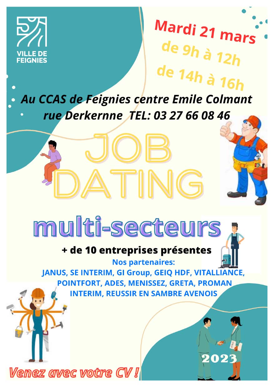 mars, 2023 Atelier Job dating Centre Emile Colmant rue Alfred Derkenne 2023mar21mar9 h 00 min16 h 00 minAtelier Job dating9 h 00 min - 16 h 00 min Centre Emile Colmant, rue Alfred DerkenneType d'événement:Jeunesse,Santé,Solidarité Détails de l'événement Détails de l'événement Date (Mardi) 9 h 00 min - 16 h 00 min LieuCentre Emile Colmantrue Alfred Derkenne CalendrierCalendrier Google
