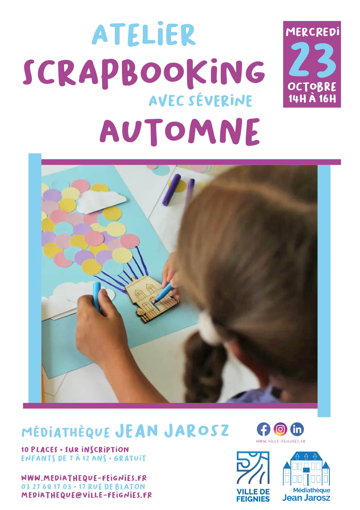 octobre, 2024 Atelier scrapbooking Médiathèque Jean Jarosz 17 rue de Blaton 2024mer23oct14 h 00 min16 h 00 minAtelier scrapbookingorganisé par la Médiathèque Jean Jarosz14 h 00 min - 16 h 00 min Médiathèque Jean Jarosz, 17 rue de BlatonType d'événement:Culture,Jeunesse,Travaux manuels Détails de l'événement Détails de l'événement Date (Mercredi) 14 h 00 min - 16 h 00 min LieuMédiathèque Jean Jarosz17 rue de Blaton CalendrierCalendrier Google