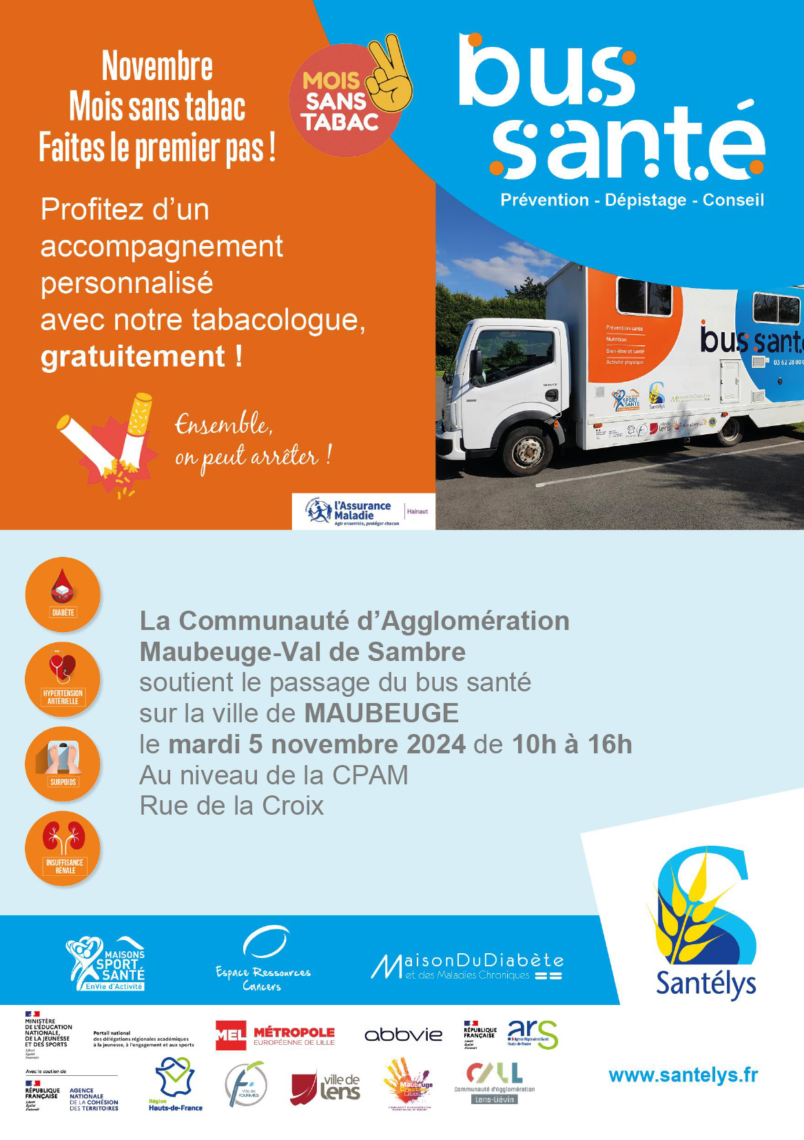 novembre, 2024 Bus santé - Un mois sans tabac 2024mar05nov10 h 00 min16 h 00 minBus santé - Un mois sans tabacorganisée par la Communauté d'Agglomération Maubeuge-Val de Sambre10 h 00 min - 16 h 00 min Rue de la Croix à Maubeuge (à proximité de la CPAM)Type d'événement:Santé,Solidarité Détails de l'événement Détails de l'événement Date (Mardi) 10 h 00 min - 16 h 00 min LieuRue de la Croix à Maubeuge (à proximité de la CPAM) CalendrierCalendrier Google