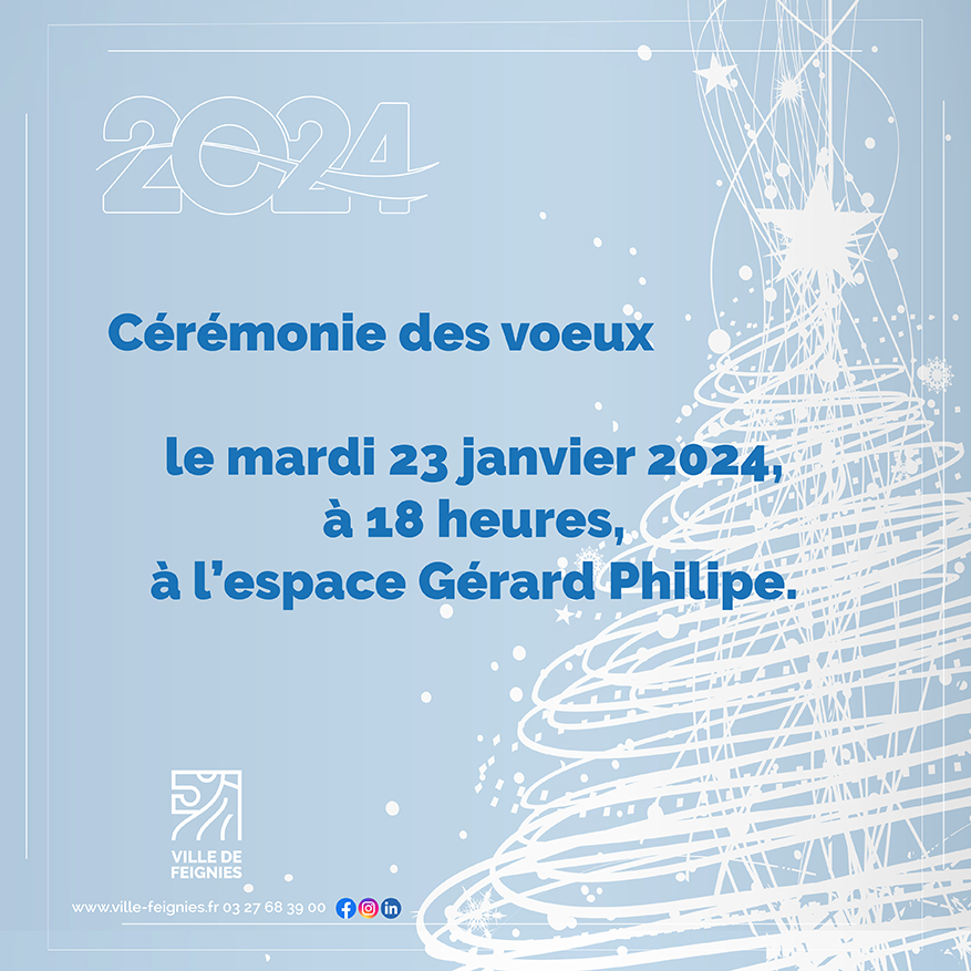 2024mar23jan18 h 00 min19 h 30 minCérémonie des vœux 202418 h 00 min - 19 h 30 min Espace Gérard Philipe, Place Charles de GaulleType d'événement:Culture,Élections,Emploi,Environnement,Fêtes,Jeunesse,Musique,Santé,Sécurité,Solidarité,Sport