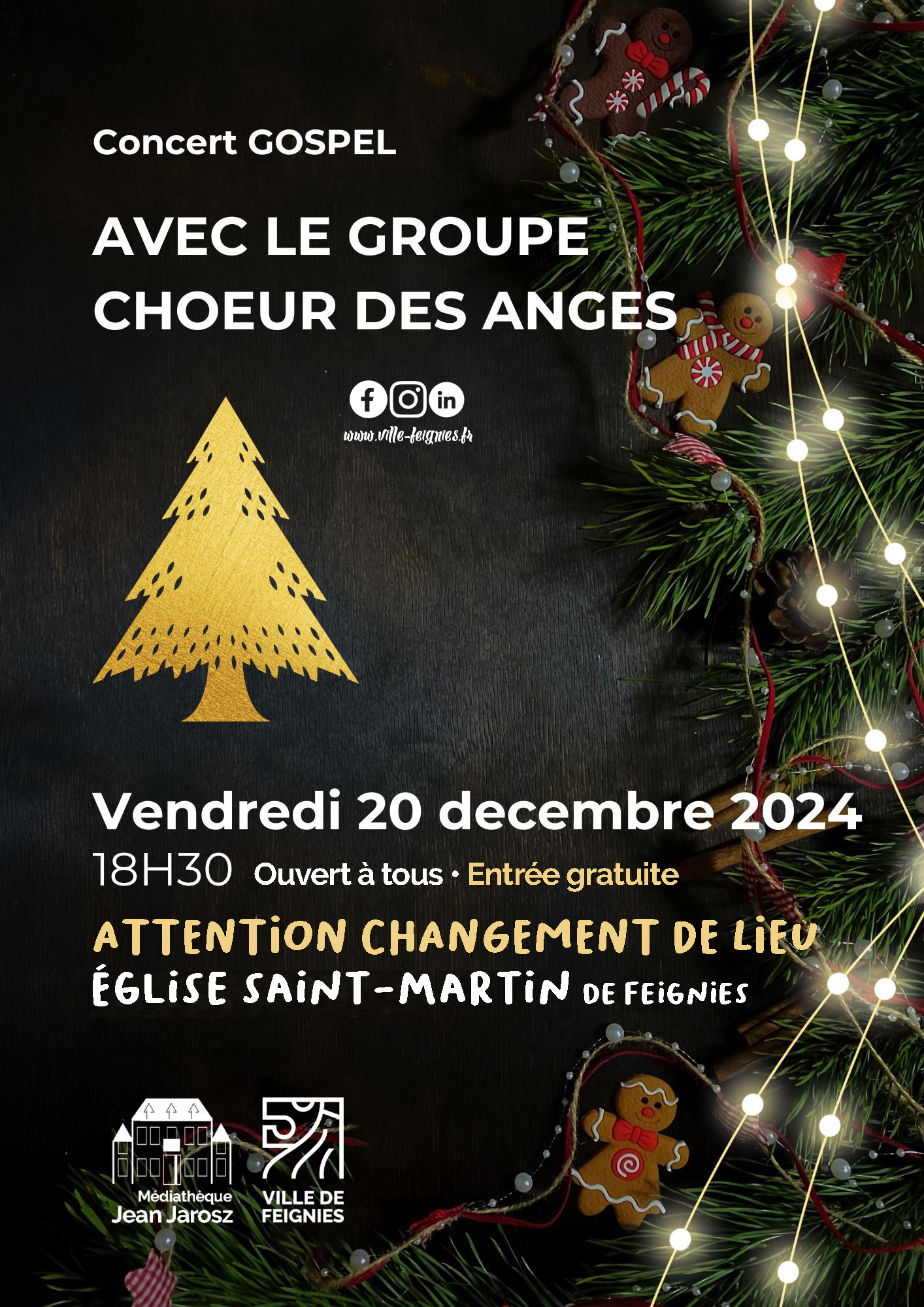 décembre, 2024 Concert de Gospel avec Chœur des Anges 2024ven20dec18 h 30 min20 h 00 minConcert de Gospel avec Chœur des Anges18 h 30 min - 20 h 00 min Église Saint-Martin à Feignies Event Organized By: Médiathèque Jean Jarosz Type d'événement:Concert,Fêtes,Noël Détails de l'événementATTENTION CHANGEMENT DE LIEU Le concert se tiendra à l'Église Saint-Martin de Feignies Détails de l'événement ATTENTION CHANGEMENT DE LIEU Le concert se tiendra à l’Église Saint-Martin de Feignies Date (Vendredi) 18 h 30 min - 20 h 00 min LieuÉglise Saint-Martin à Feignies Organizer Médiathèque Jean Jarosz CalendrierCalendrier Google