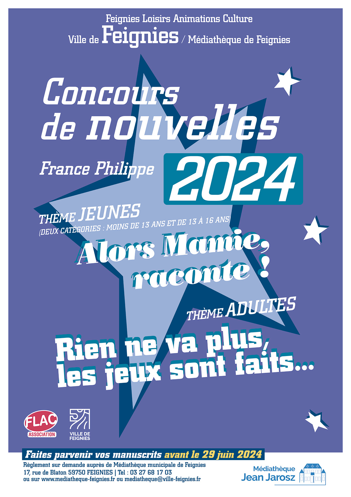 avril, 2024 Concours de nouvelles 2024 Médiathèque Jean Jarosz 17 rue de Blaton 2024mar09avr(avr 9)11 h 25 minsam29juin(juin 29)23 h 59 minConcours de nouvelles 2024(avril 9) 11 h 25 min - (juin 29) 23 h 59 min Médiathèque Jean Jarosz, 17 rue de BlatonType d'événement:Culture,Jeunesse Détails de l'événement Détails de l'événement Date Avril 9 (Mardi) 11 h 25 min - Juin 29 (Samedi) 23 h 59 min LieuMédiathèque Jean Jarosz17 rue de Blaton CalendrierCalendrier Google