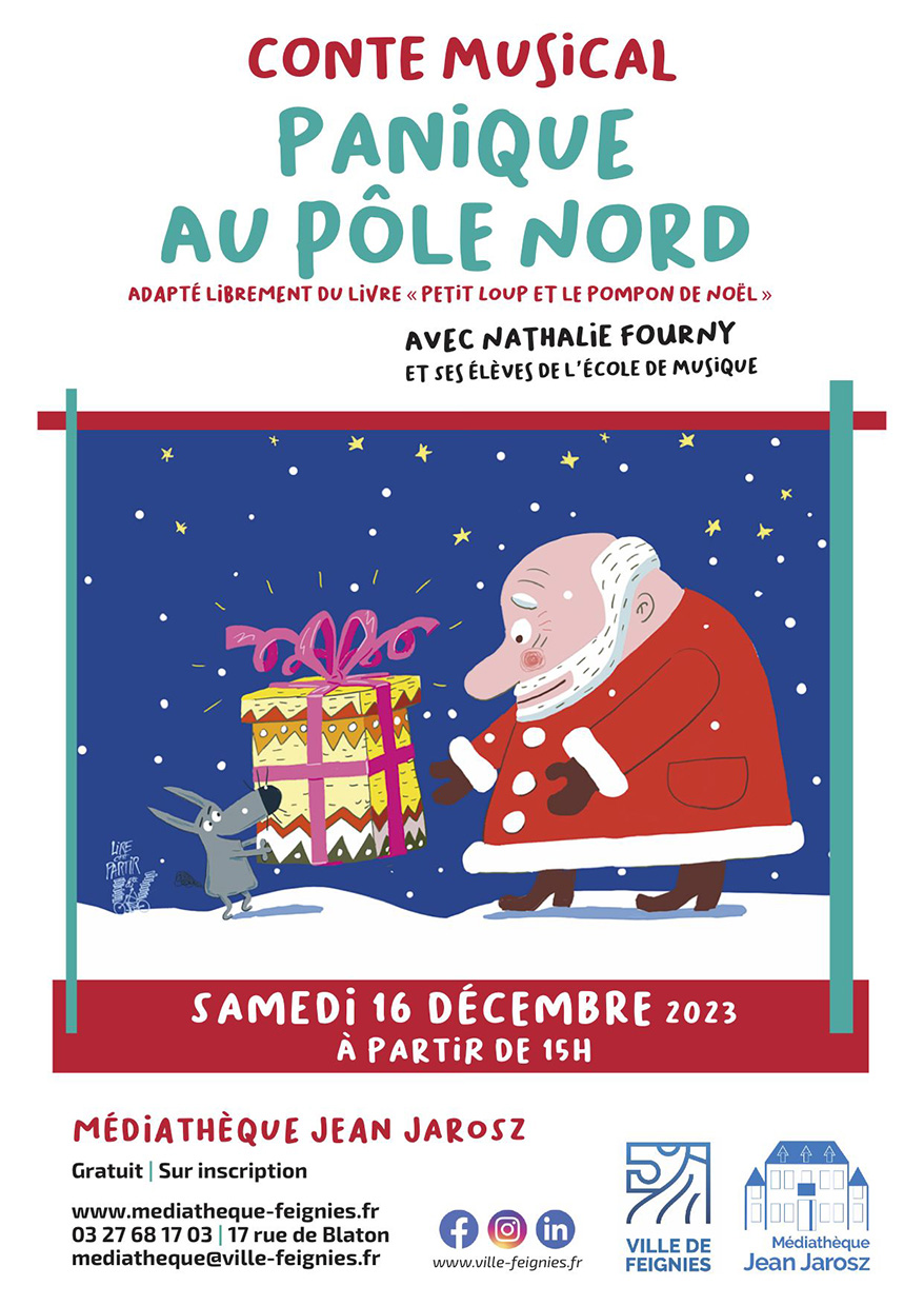 décembre, 2023 Conte musical « Panique au Pôle Nord » Médiathèque Jean Jarosz 17 rue de Blaton 2023sam16dec15 h 00 min17 h 00 minConte musical « Panique au Pôle Nord »15 h 00 min - 17 h 00 min Médiathèque Jean Jarosz, 17 rue de BlatonType d'événement:Culture,Fêtes,Jeunesse,Musique Détails de l'événement Détails de l'événement Date (Samedi) 15 h 00 min - 17 h 00 min LieuMédiathèque Jean Jarosz17 rue de Blaton CalendrierCalendrier Google