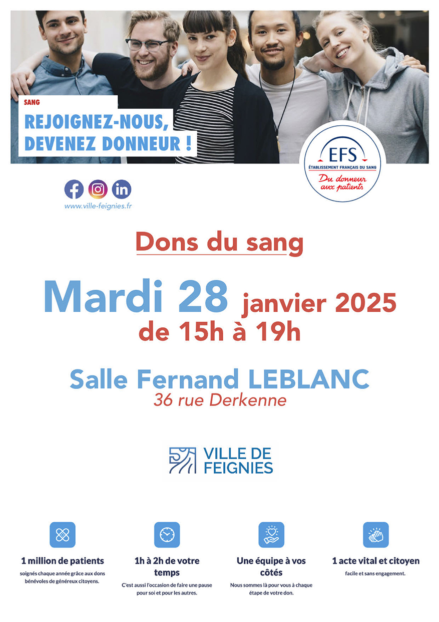 janvier, 2025 Don du sang Salle Fernand Leblanc rue Alfred Derkenne 2025mar28jan15 h 00 min19 h 00 minDon du sang15 h 00 min - 19 h 00 min Salle Fernand Leblanc, rue Alfred Derkenne Event Organized By: Établissement Français du Sang Type d'événement:Santé,Secours,Solidarité Détails de l'événement Détails de l'événement Date (Mardi) 15 h 00 min - 19 h 00 min LieuSalle Fernand Leblancrue Alfred Derkenne Organizer Établissement Français du Sang CalendrierCalendrier Google