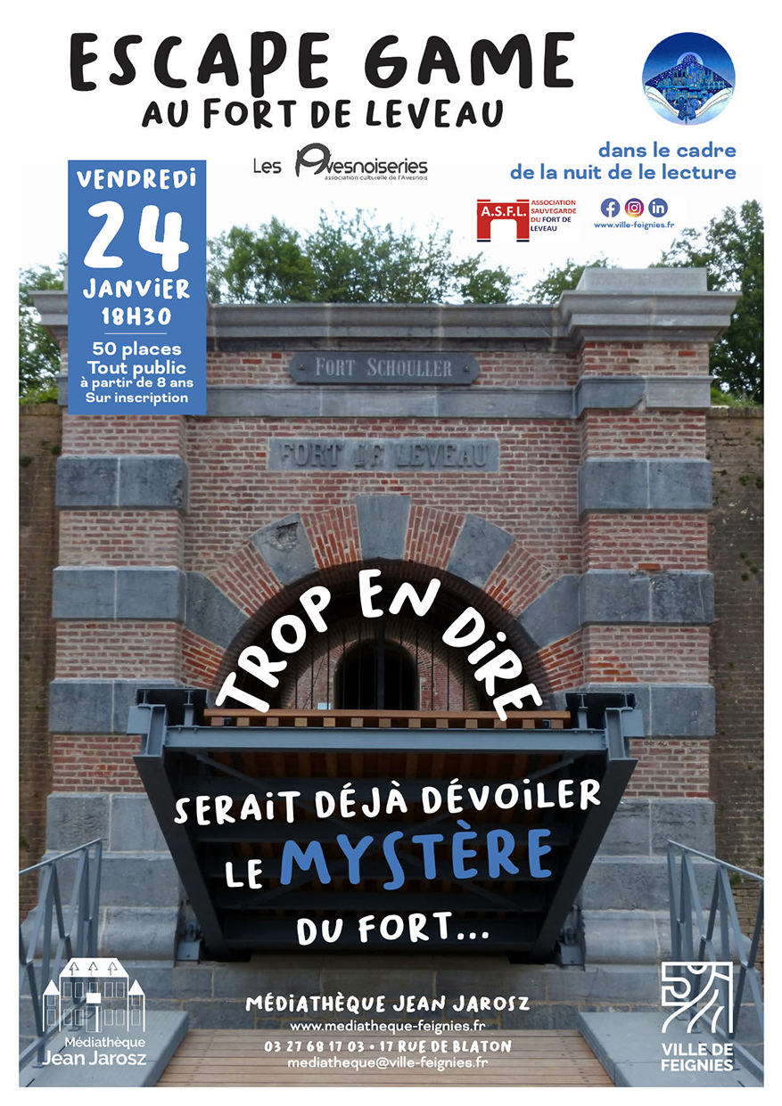 janvier, 2025 Escape Game au Fort de Leveau 2025ven24jan18 h 30 min20 h 30 minEscape Game au Fort de Leveauorganisé par la médiathèque Jean Jarosz et les Avesnoiseries18 h 30 min - 20 h 30 min Fort de LeveauType d'événement:Culture,Escape game,Jeunesse,Jeux,Sport Détails de l'événement Détails de l'événement Date (Vendredi) 18 h 30 min - 20 h 30 min LieuFort de Leveau CalendrierCalendrier Google