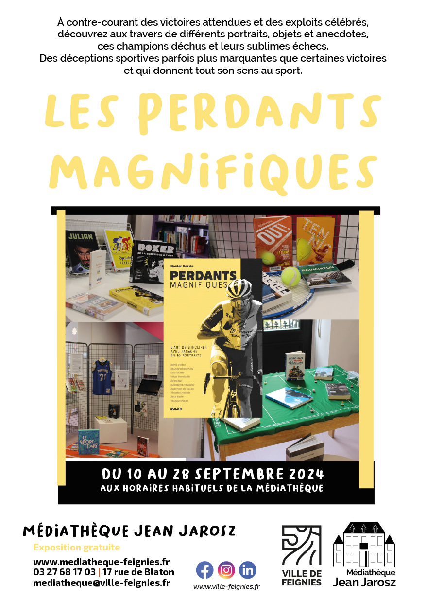 septembre, 2024 Exposition « Les perdants magnifiques » Médiathèque Jean Jarosz 17 rue de Blaton 2024mar10sepToute la journéesam28Exposition « Les perdants magnifiques »(Toute la journée) Médiathèque Jean Jarosz, 17 rue de BlatonType d'événement:Culture,Sport Détails de l'événement Détails de l'événement Date septembre 10 (Mardi) - 28 (Samedi) LieuMédiathèque Jean Jarosz17 rue de Blaton CalendrierCalendrier Google