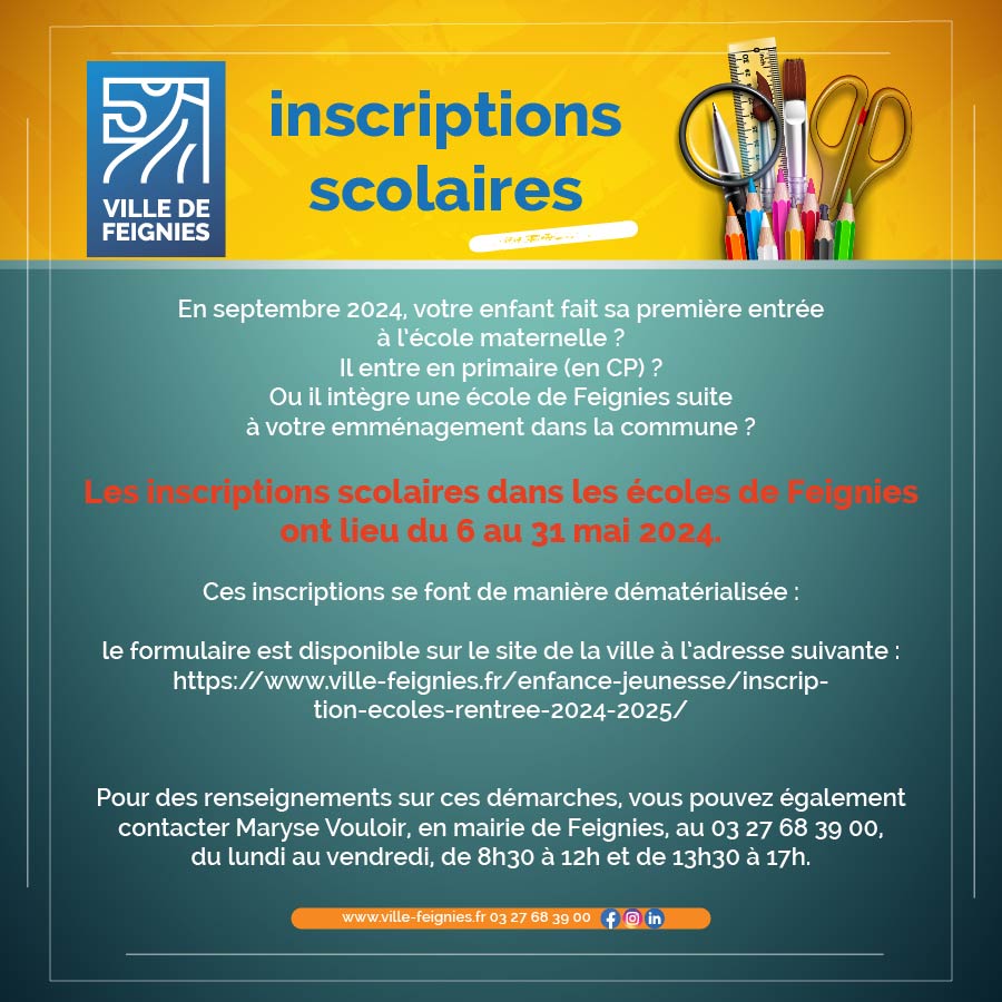 mai, 2024 Inscriptions scolaires 2024/2025 2024lun06mai(mai 6)0 h 00 minven31(mai 31)0 h 00 minInscriptions scolaires 2024/20250 h 00 min - 0 h 00 min (31) Type d'événement:Jeunesse Détails de l'événement Plus d'infos Détails de l'événement Plus d’infos Date6 (Lundi) 0 h 00 min - 31 (Vendredi) 0 h 00 min CalendrierCalendrier Google
