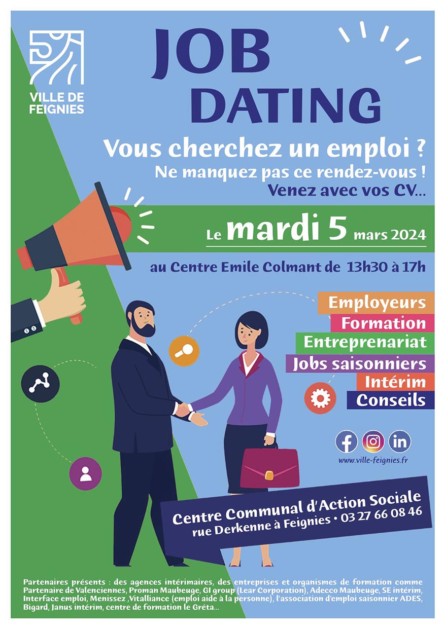 mars, 2024 Job dating Centre Emile Colmant rue Alfred Derkenne 2024mar05mar13 h 30 min17 h 00 minJob dating13 h 30 min - 17 h 00 min Centre Emile Colmant, rue Alfred DerkenneType d'événement:Emploi,Jeunesse,Solidarité Détails de l'événement Détails de l'événement Date (Mardi) 13 h 30 min - 17 h 00 min LieuCentre Emile Colmantrue Alfred Derkenne CalendrierCalendrier Google
