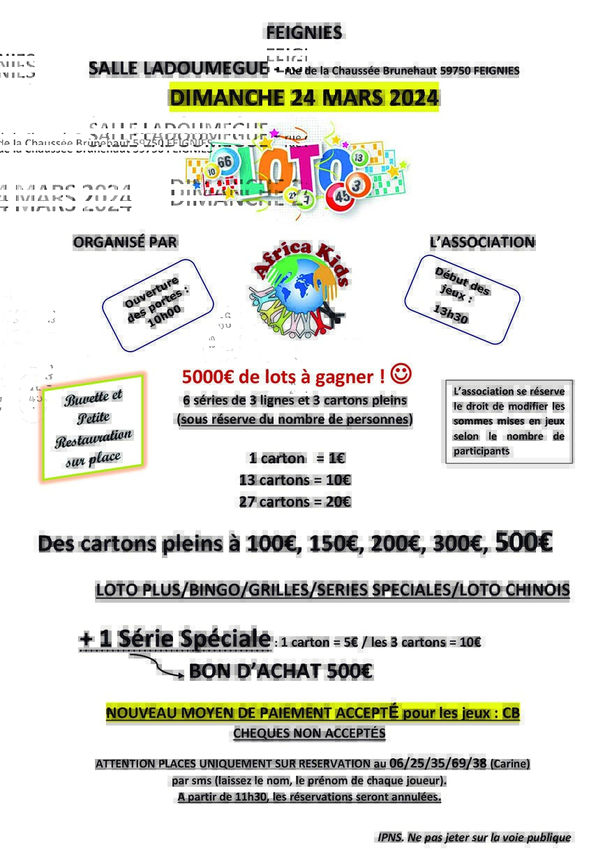 mars, 2024 Loto Africa Kids Halle des Sports Jules Ladoumègue rue de la Chaussée Brunehaut 2024dim24mar13 h 30 min20 h 00 minLoto Africa Kids13 h 30 min - 20 h 00 min Halle des Sports Jules Ladoumègue, rue de la Chaussée BrunehautType d'événement:Fêtes,Jeunesse Détails de l'événement Détails de l'événement Date (Dimanche) 13 h 30 min - 20 h 00 min LieuHalle des Sports Jules Ladoumèguerue de la Chaussée Brunehaut CalendrierCalendrier Google