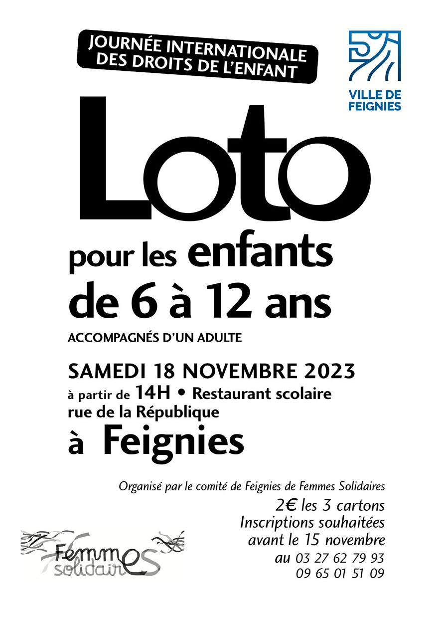 novembre, 2023 Loto pour enfants Restaurant scolaire 4 rue Roger Salengro, Feignies 2023sam18nov14 h 00 min18 h 00 minLoto pour enfantsorganisé par le Comité de Feignies de Femmes Solidaires14 h 00 min - 18 h 00 min Restaurant scolaire, 4 rue Roger Salengro, FeigniesType d'événement:Fêtes,Jeunesse Détails de l'événement Détails de l'événement Date (Samedi) 14 h 00 min - 18 h 00 min LieuRestaurant scolaire4 rue Roger Salengro, Feignies CalendrierCalendrier Google