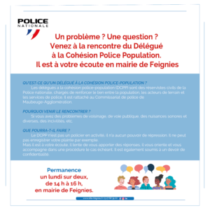 Un problème ? Une question ? Venez à la rencontre du Délégué à la Cohésion Police Population. Il est à votre écoute en mairie de Feignies.