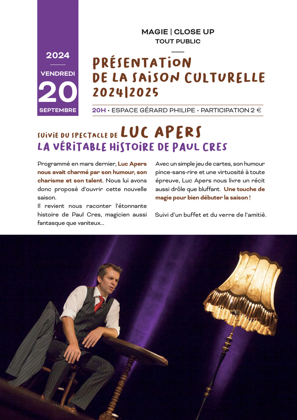 septembre, 2024 Présentation de la saison culturelle 2024|2025 Espace Gérard Philipe Place Charles de Gaulle 2024ven20sep20 h 00 min22 h 30 minPrésentation de la saison culturelle 2024|202520 h 00 min - 22 h 30 min Espace Gérard Philipe, Place Charles de GaulleType d'événement:Culture,Spectacle Détails de l'événement Détails de l'événement Date (Vendredi) 20 h 00 min - 22 h 30 min LieuEspace Gérard PhilipePlace Charles de Gaulle CalendrierCalendrier Google