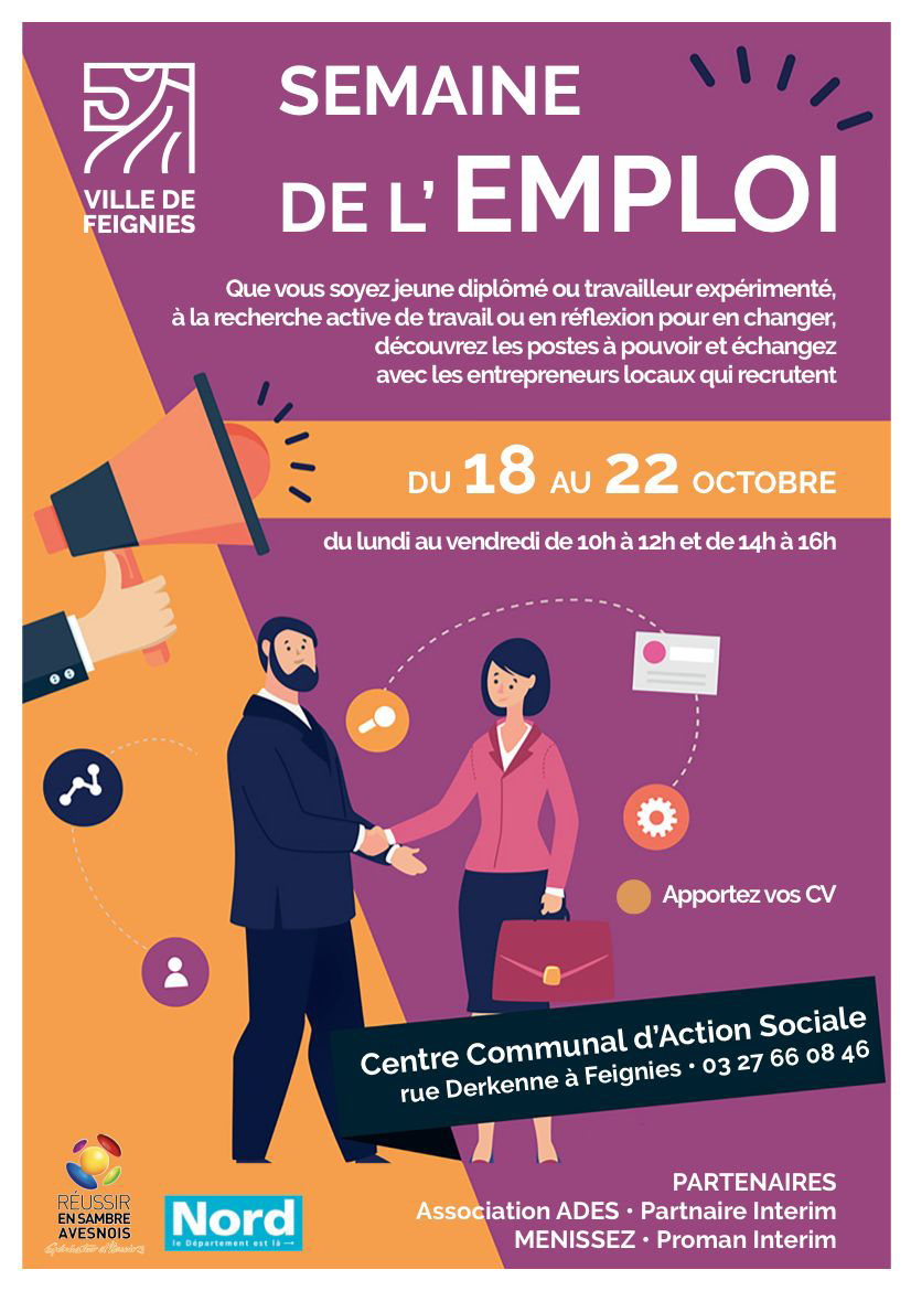 octobre, 2021 Semaine de l'emploi Centre Emile Colmant rue Alfred Derkenne 2021lun18octToute la journéeven22Semaine de l'emploi(Toute la journée) Centre Emile Colmant, rue Alfred DerkenneType d'événement:Culture,Environnement,Jeunesse,Solidarité Détails de l'événement Détails de l'événement Date octobre 18 (Lundi) - 22 (Vendredi) LieuCentre Emile Colmantrue Alfred Derkenne CalendrierCalendrier Google