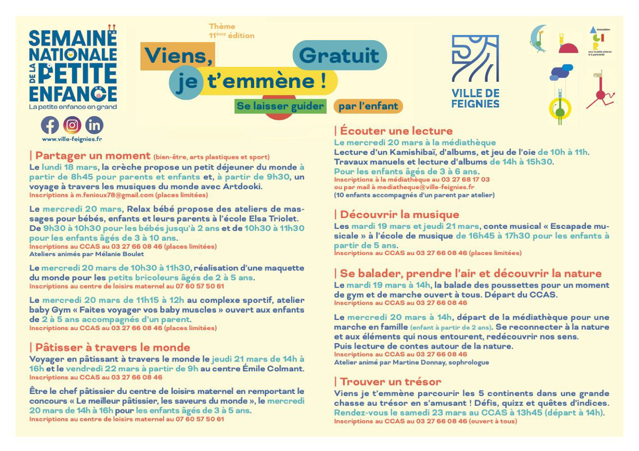 mars, 2024 Semaine nationale de la petite enfance 2024lun18mar(mar 18)0 h 00 minsam23(mar 23)0 h 00 minSemaine nationale de la petite enfance0 h 00 min - 0 h 00 min (23) Type d'événement:Culture,Fêtes,Jeunesse,Musique,Spectacle Détails de l'événement En savoir plus Détails de l'événement Date18 (Lundi) 0 h 00 min - 23 (Samedi) 0 h 00 min CalendrierCalendrier Google
