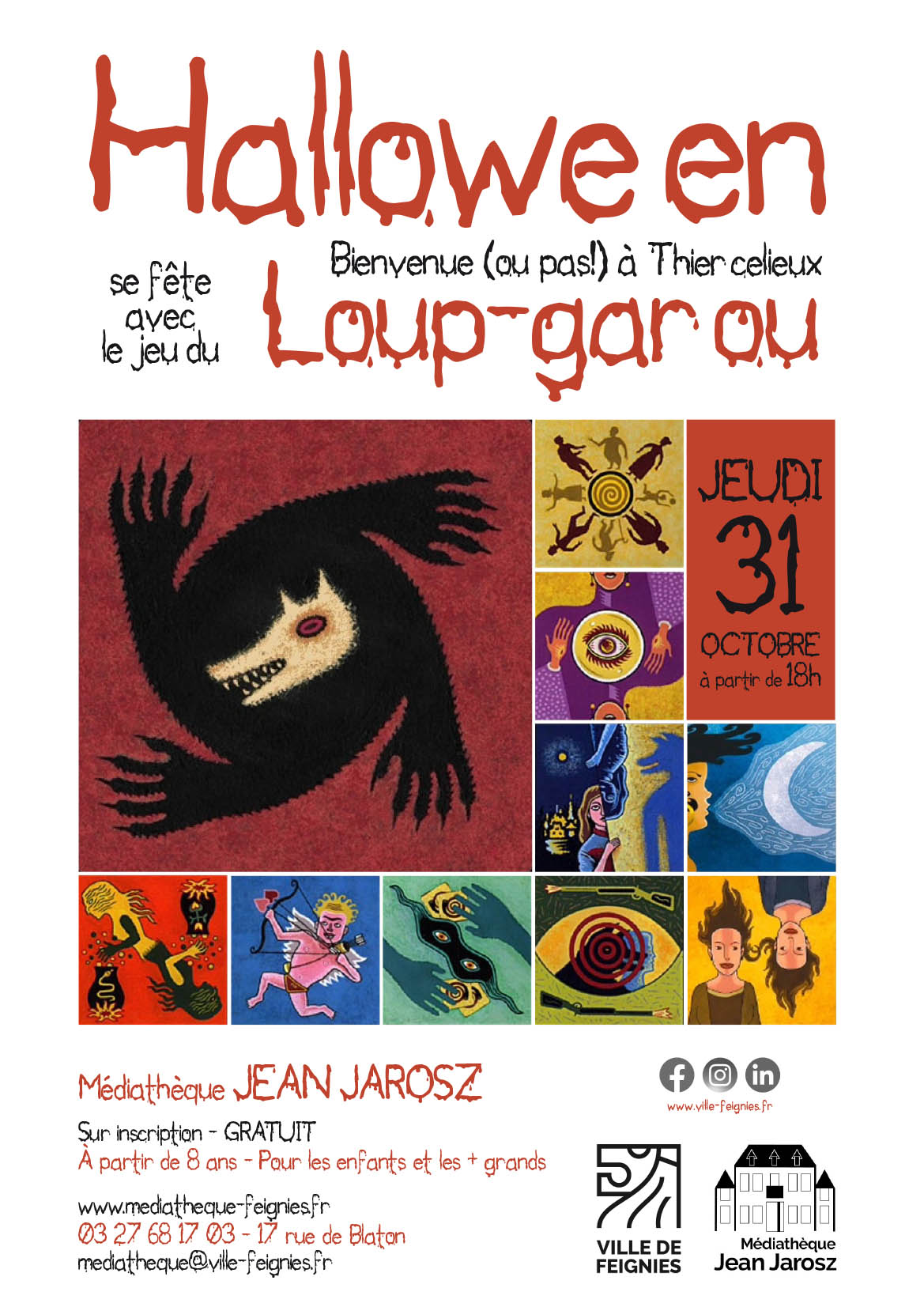 octobre, 2024 Soirée Halloween et loup-garou Médiathèque Jean Jarosz 17 rue de Blaton 2024jeu31oct18 h 00 min20 h 00 minSoirée Halloween et loup-garouorganisée par la Médiathèque Jean Jarosz18 h 00 min - 20 h 00 min Médiathèque Jean Jarosz, 17 rue de BlatonType d'événement:Culture,Fêtes,Halloween,Jeunesse Détails de l'événement Détails de l'événement Date (Jeudi) 18 h 00 min - 20 h 00 min LieuMédiathèque Jean Jarosz17 rue de Blaton CalendrierCalendrier Google