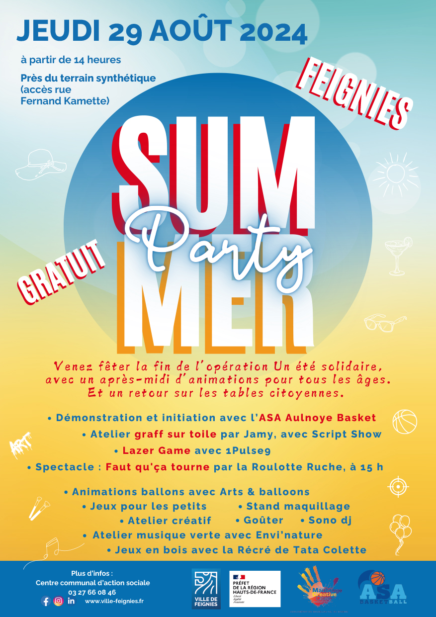 août, 2024 Summer Party 2024jeu29août14 h 00 min18 h 00 minSummer Partyorganisée par Pôle Éducation, Citoyenneté et Solidarités14 h 00 min - 18 h 00 min rue Fernand KametteType d'événement:Culture,Fêtes,Jeunesse,Solidarité,Spectacle,Sport,Travaux manuels Détails de l'événementSummer Party pour fêter la fin de l'opération « Un été solidaire, pour tous » Détails de l'événement Summer Party pour fêter la fin de l’opération « Un été solidaire, pour tous » Date (Jeudi) 14 h 00 min - 18 h 00 min Lieurue Fernand Kamette CalendrierCalendrier Google