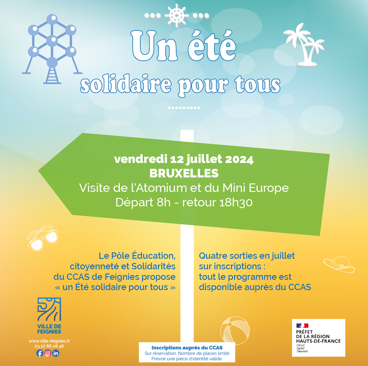juillet, 2024 Un été solidaire Visite de l'Atomium et du Mini Europe de Bruxelles Centre Emile Colmant rue Alfred Derkenne 2024ven12juil8 h 00 min18 h 30 minUn été solidaire Visite de l'Atomium et du Mini Europe de BruxellesDans le cadre d'un été solidaire pour tous8 h 00 min - 18 h 30 min Centre Emile Colmant, rue Alfred DerkenneType d'événement:Culture,Jeunesse,Solidarité Détails de l'événement Détails de l'événement Date (Vendredi) 8 h 00 min - 18 h 30 min LieuCentre Emile Colmantrue Alfred Derkenne CalendrierCalendrier Google