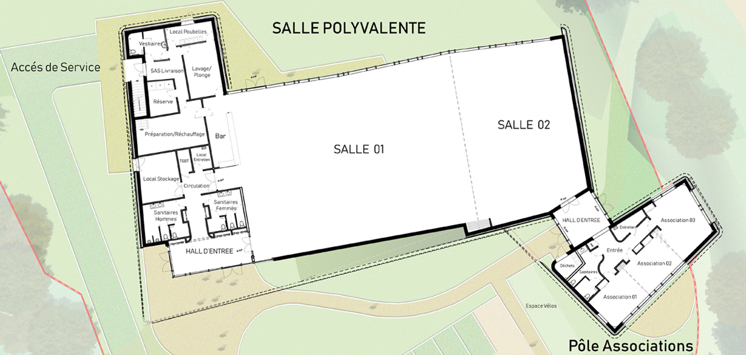 Un espace associatif indépendant, connecté à la salle principale par un hall et composé de 3 salles associatives de 20 à 30 m² modulables pour être transformées en 1 salle de 70 m².