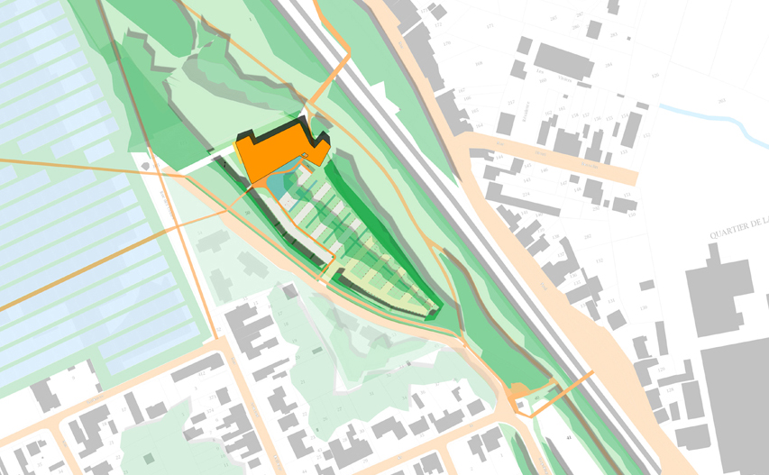 Situé à proximité de la voie de chemin de fer, rue des Usines, le projet est ancré au cœur d’un espace verdoyant à proximité du centre-ville et sera mené de front avec l’ambition de reconversion de la friche Sambre & Meuse.